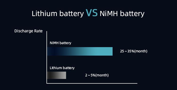 25 ~ 35% (maanden) voor Ni MH-batterij en 2 ~ 5% (maanden) voor lithium-ionbatterij.De zelfontladingssnelheid van Ni MH-batterijen is hoog, terwijl die van lithium-ionbatterijen erg laag is.