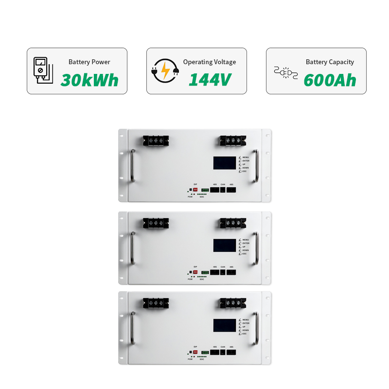 600Ah Lifepo4-lithiumbatterijen zijn voornamelijk bedoeld voor de op maat gemaakte ontwikkeling van back-upvoedingsproducten met hoog vermogen voor DC-toepassingen, om noodstroom te leveren.Accusysteem bestaat uit 3 modules parallel om een 48V600Ah-systeem te vormen